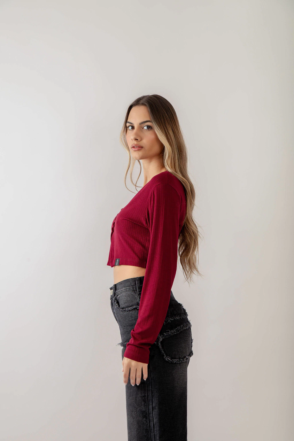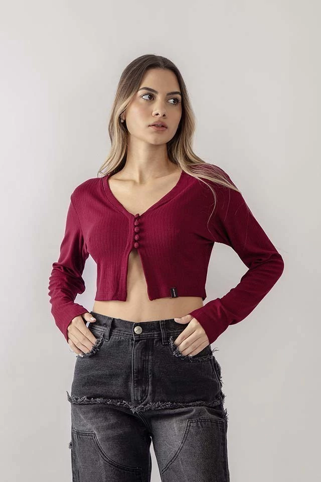 Cropped Manga Longa Botão Canelado Bordô Anticool