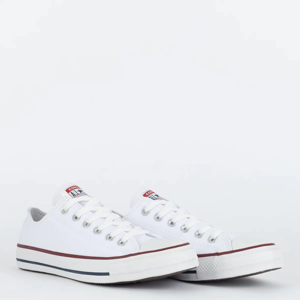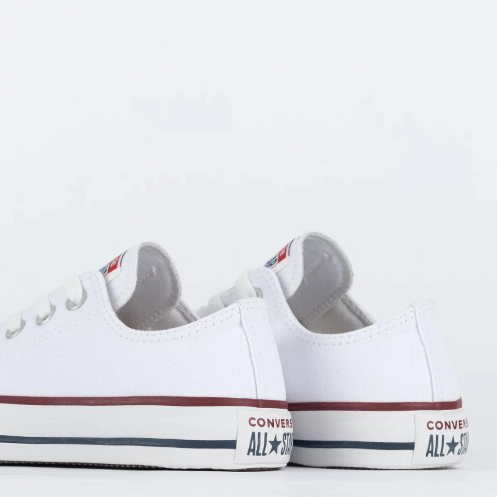 Tênis Converse Chuck Taylor All Star Core Ox Branco, o mais tradicional da Converse All Star. Confeccionado em tecido canvas de algodão tipo lona. Os cadarços seguem a cor das costuras e da vira da borracha. Os ilhoses aparecem na tonalidade prateada, incluindo os dois laterais responsáveis pela transpiração adequada dos pés. O logo Converse All Star aparece na tag traseira aplicada no calcanhar. A vira e o solado de borracha vulcanizada proporciona uma aderência perfeita ao caminhar.